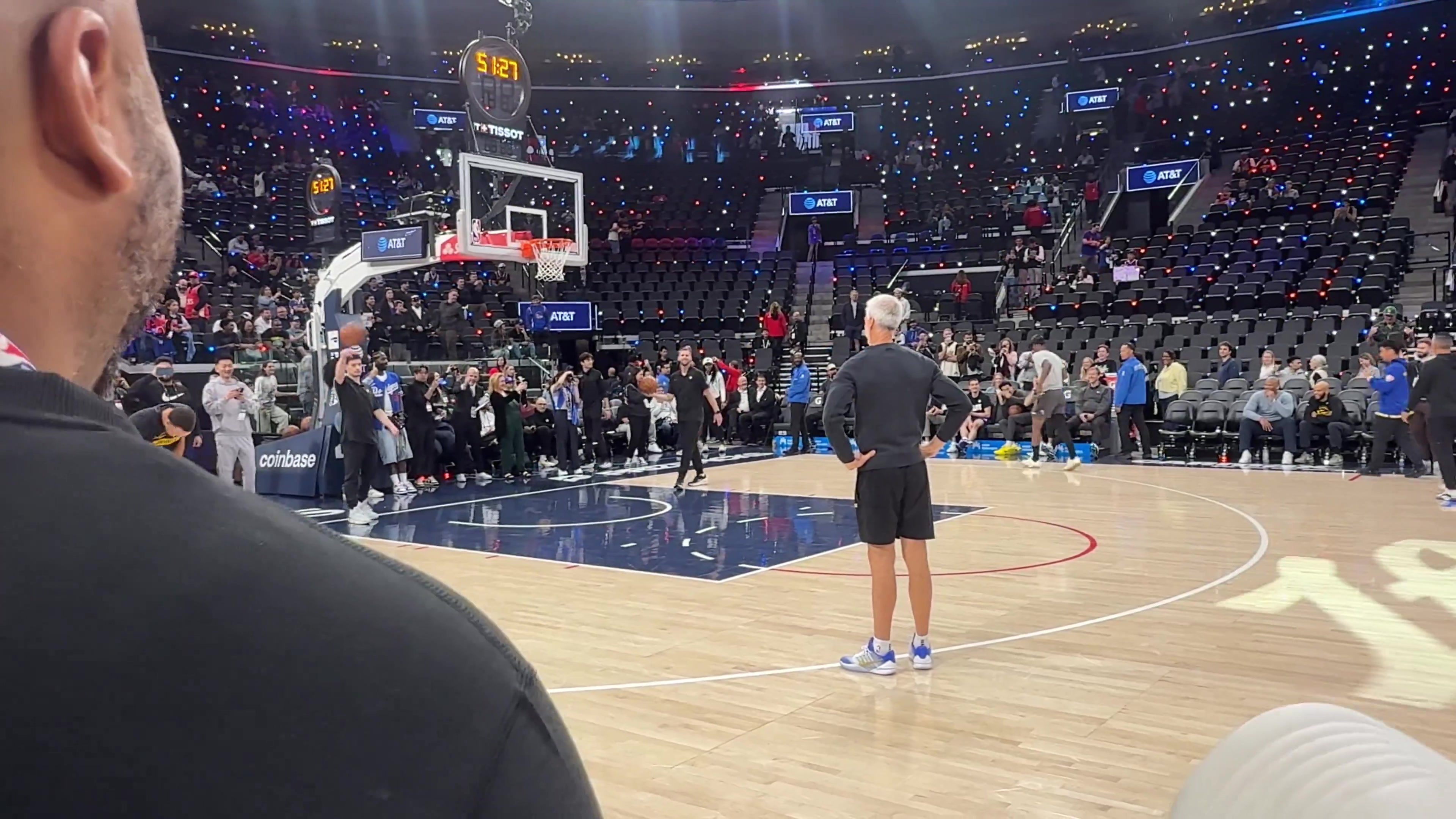 此前遭遇十字韧带撕裂的巴特勒今日随队出征客场,在库里赛前热身时,他一瘸一拐地上场投了一个三分,结果是三不沾,把库里笑弯腰了……
